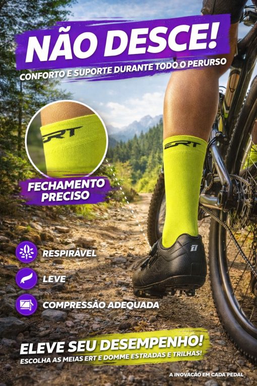 As Meias de Ciclismo ERT são a combinação perfeita de conforto e desempenho para os amantes do ciclismo. Projetadas especificamente para atender às necessidades dos ciclistas, nossas meias oferecem uma experiência excepcional em cada pedalada. Feitas com fios de poliamida, elas são respiráveis, leves e possuem compressão adequada, garantindo conforto e suporte durante todo o percurso. Escolha as Meias de Ciclismo ERT e eleve seu desempenho nas estradas e trilhas ao próximo nível.