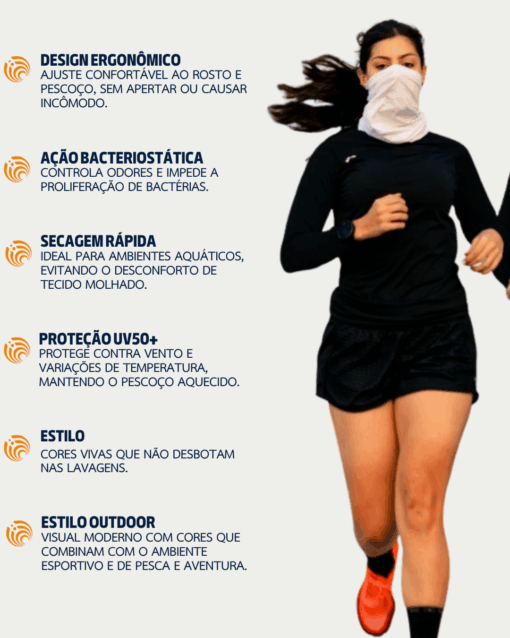 - Formato: Tubular versátil – use como faixa, máscara, pescoceira, pulseira ou como quiser