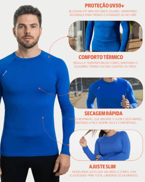 A camisa de manga longa unissex é ideal para quem pratica corrida, ciclismo, beach tennis, trilha, musculação e pesca esportiva. Desenvolvida com proteção solar UV50+, oferece conforto térmico, tecnologia SunDry, secagem rápida e absorção de suor, sendo uma peça respirável, com compressão leve e design ergonômico que se ajusta ao corpo com liberdade de movimento.