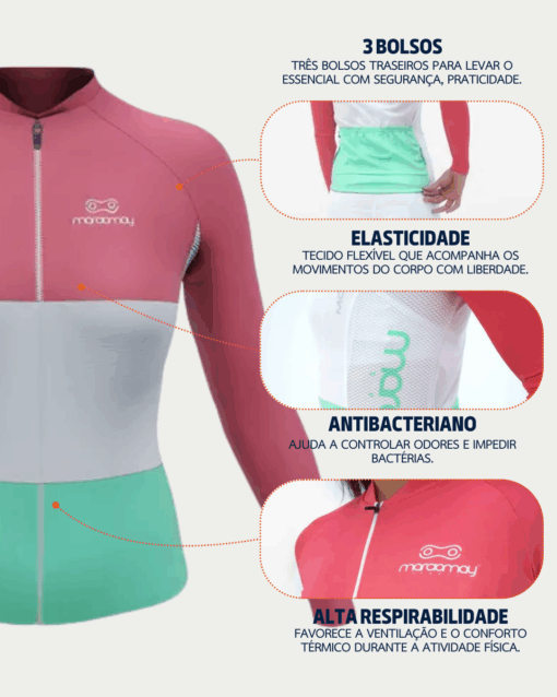 A modelagem ergonômica foi pensada para entregar liberdade total de movimento e aerodinâmica. Com isso, o ciclista alcança alto rendimento sem perder o ajuste ao corpo.