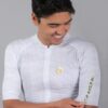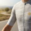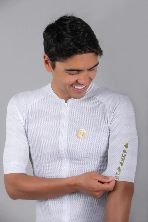 Conforto e Ajuste: Corte ajustado com acabamento em corte a frio na gola e mangas, além de elástico siliconado italiano na barra, que evita o deslocamento da peça durante o pedal.