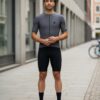 Conforto e Ajuste: Corte ajustado com acabamento em corte a frio na gola e mangas, além de elástico siliconado italiano na barra, que evita o deslocamento da peça durante o pedal.