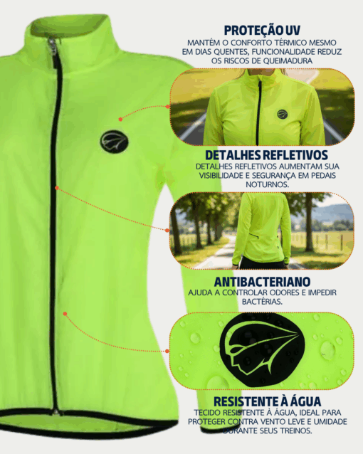 Tecido tratado com bloqueadores UFP50+, que ajudam a prevenir queimaduras. (Essa proteção foi testada e analisada por um laboratório especializado, porém não dispensa o uso de protetor solar)