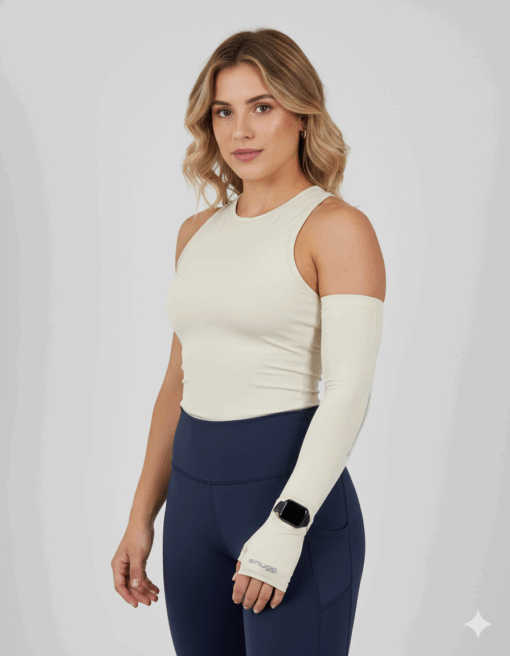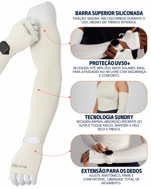 Manguito unissex com abertura para relógio, ideal para corrida, ciclismo, trilha, academia, pesca esportiva e beach tennis, com proteção solar UV50+, tecnologia SunDry, secagem rápida, conforto térmico, respirável, compressão leve, estilo fitness, design anatômico, uso esportivo, técnico e para atividades ao ar livre, compatível com smartwatch.