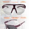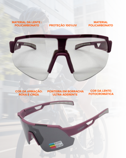 Os óculos de ciclismo Elleven EL61 com lentes fotocromáticas UV400 e armação em policarbonato nas cores roxo e cinza são leves, ideais para uso esportivo em MTB, estrada ou ambiente urbano, oferecendo máxima proteção, conforto, estilo e performance, acompanhados de case protetor e flanela de limpeza.