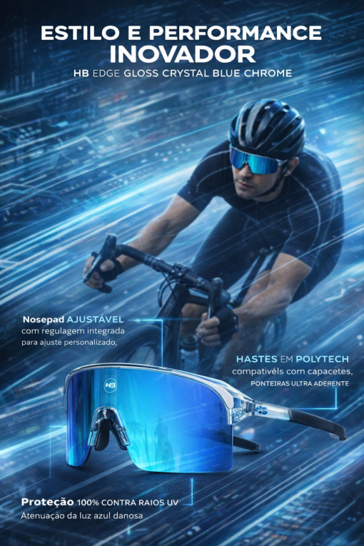 Óculos de Sol HB Edge Gloss Crystal Blue Chrome O acessório perfeito para quem busca estilo, conforto e performance em qualquer pedal ou atividade esportiva.