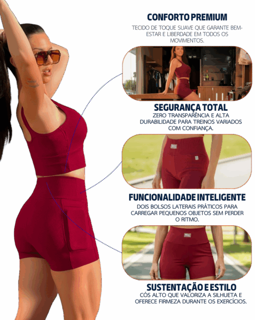 - Dois bolsos laterais funcionais: permitem praticidade no transporte de pequenos objetos durante a atividade.