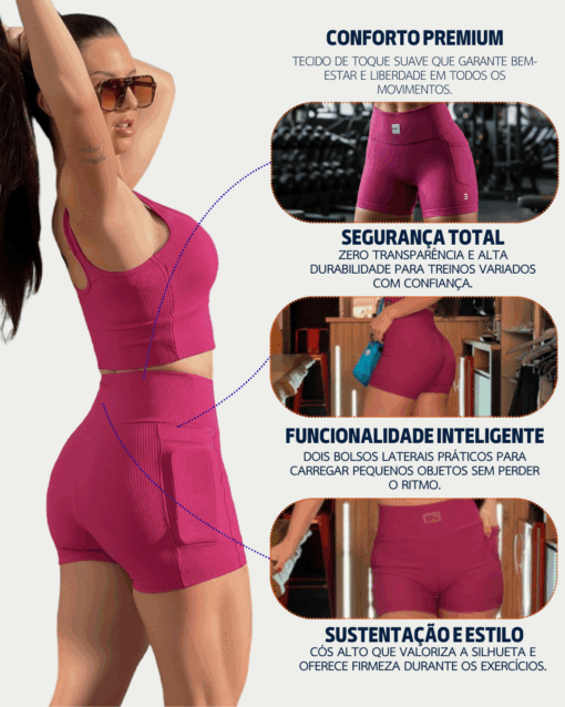- Dois bolsos laterais funcionais: permitem praticidade no transporte de pequenos objetos durante a atividade.